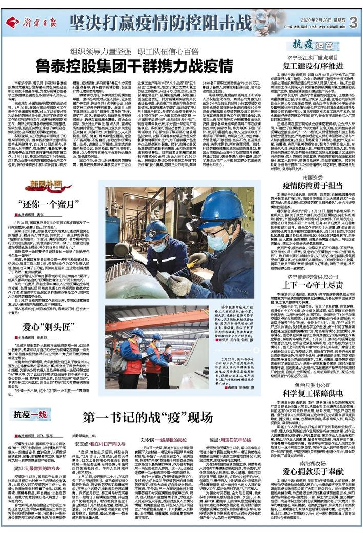 主动作为,全力以赴保障疫情防控所需。鲁泰控股集团认真落实全市工业企业复工生产导则中的“八个必须”和“五个到位”工作要求,制定了复工方案和复工防疫工作指南,开足马力、加班加点,全力保障正常生产、疫情防控所需,积极履行国企社会责任。针对疫情期间省内外交通运输受阻、多家电厂电煤库存告急等实际情况,集团所属太平煤矿、鹿洼煤矿于2月5日复产复工,各煤矿企业领导班子24小时吃住在矿,一方面抓实疫情防控,一方面科学组织生产,主动对接各个电厂,制定电煤保供方案,千方百计保证电厂电煤供应。积极履行国企社会责任,集团公司领导班子在春节前了解到部分消杀用品短缺后,安排下属鲁泰化学全力组织次氯酸钠消毒原液生产,为下游消毒产品生产企业提供原料保障。同时,向周边县区免费提供次氯酸钠消毒剂,全力协助政府遏制疫情蔓延。目前已累计捐赠次氯酸钠消毒液480余吨,折合人民币近20万元。积极组织集团公司干部职工开展“抗击疫情”爱心捐款,短短三天的时间,集团5196名干部职工捐助资金79.2325万元,彰显了鲁泰人关键时刻挺身而出、使命必达的国企担当。